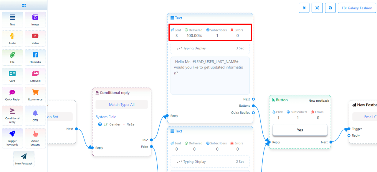Manage post back actions with ease using Postback Manager. Set up actions that occur when users interact with your bot's postback buttons.